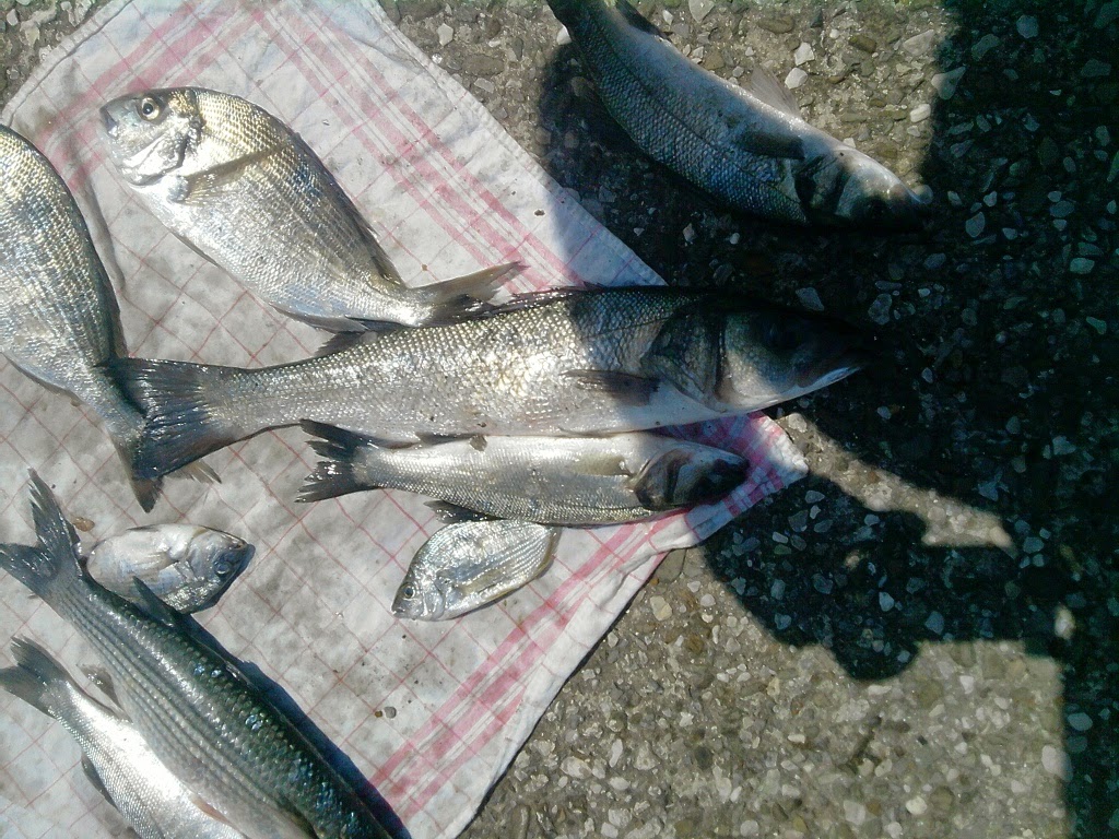 Appena dopo 5 minuti che il galleggiante era in acqua, aggancio una spigola di discrete dimensioni. Subito dopo, riesco a guadinare una grossa spigola e, sorprendentemente anche un'orata, che solitamente ad Agropoli si pescano a fondo. Dopo una serie di spigole e orate, verso le 9 e 30 pesco un grosso cefalo e 2 occhiate.