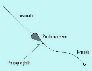 La montatura scorrevole, veniva usata in passato per tutti i tipi di pesca a fondo. E' semplicissima da realizzare: si inserisce la lenza madre nel piombo, alla fine di essa si applica un paracolpi e la girella a cui verrà agganciato il terminale dalla lunghezza da noi desiderata. Essa attinge i suoi punti di forza proprio dalla sua semplicità, perché può essere utilizzata con successo nelle zone delle grandi foci, dove la corrente dell'acqua in uscita farà stendere al meglio il terminale ed è consigliabile utilizzarla se si pesca con grossi bocconi, alla ricerca di pesci forti e di grosse dimensioni, perché avendo il terminale in linea con la lenza madre, i nodi sulle girelle subiranno uno "stress minore".